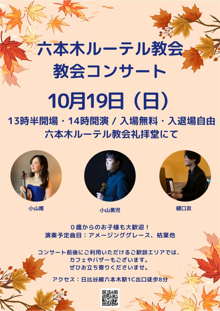 10月19日(日)午後2時から3時まで教会コンサートを開催します(開場は午後1時半)。コンサート前後には玄関でカフェとミニバザーもやっていますので、どうぞお越しください。