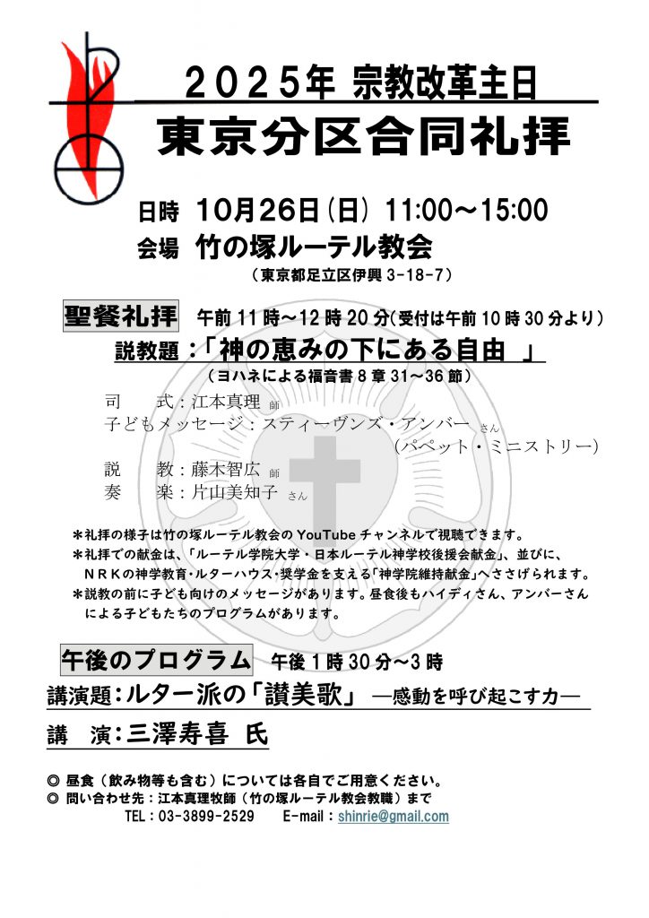 ・東京分区の合同礼拝となります。今年の会場は竹の塚ルーテル教会です。当教会での礼拝はありませんので、ご注意ください。